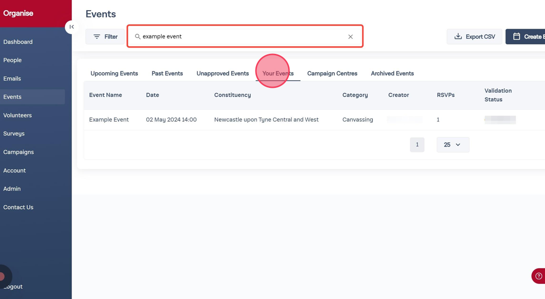 1. In the Events area of Organise, find your event. In the 'Upcoming Events' tab you will see all events in the area that you have access to on Organise. You can click 'Your Events' to see just events that you have created or type to search for a specific event by name in the search bar.