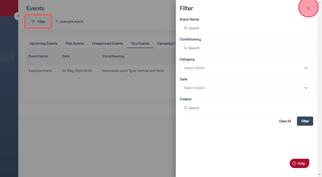 2. You can also use the Filter option to search for events by constituency, event type (category), date or by who created it. Click 'Filter' near the top left of the screen to open the filter menu.